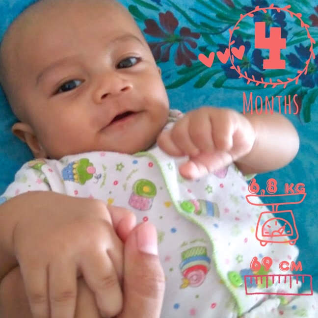 Ga kerasa si Skye sekarang sudah 4 bulan dan beratnya sudah 6,6 kg. Makin lincah kesana kemari. Padahal baru tengkurep aja tapi udah perlu kewaspadaan tingkat tinggi. Dengan gaya uler keket, dia udah bisa berpindah tempat meskipun dengan bersusah payah, hahaha. Ada perasaan amazed, haru, bahagia tiap lihat kemampuan baru Skye. Amazed karena sejauh ini aku mampu menghandle bayi (baru kali ini deh aku berurusan dengan dunia per-bayi-an). Haru karena inget perjuangannya dari hamil sampe sekarang. Bahagia karena sejauh ini dia tumbuh dengan baik.