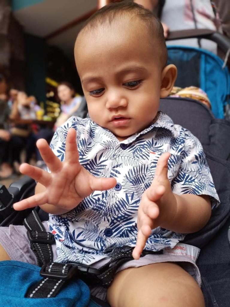 Sepanjang perjalanan dari rumah ke Jatim Park, Skye excited banget ngeliatin jalanan dari jendela mobil. Dia ga rewel dan ga mau bobok. Begitu sampai, kami buka stroller tapi sayangnya Skye ga mau duduk di stroller-nya karena emang jarang banget pake stroller. Mamaknya orang yang simple banget, ga mau repot jadi Skye emang lebih sering digendong sih, hehe.