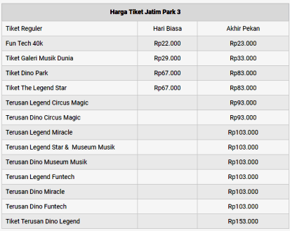 Jatim Park 3 ini buka setiap hari dari jam 11 sampai 10 malam. Wahananya lebih variatif dari Jatim Park pendahulunya. Dua wahana utamanya ada Dino Park dan Legend of Star. Di samping itu, ada juga wahana2 kecil seperti Ice Cream World, Up Side Down, Music Museum, Circus World, Infinite World, Funtech, dan masih banyak lagi. Harga tiketnya bisa dilihat disini ya.