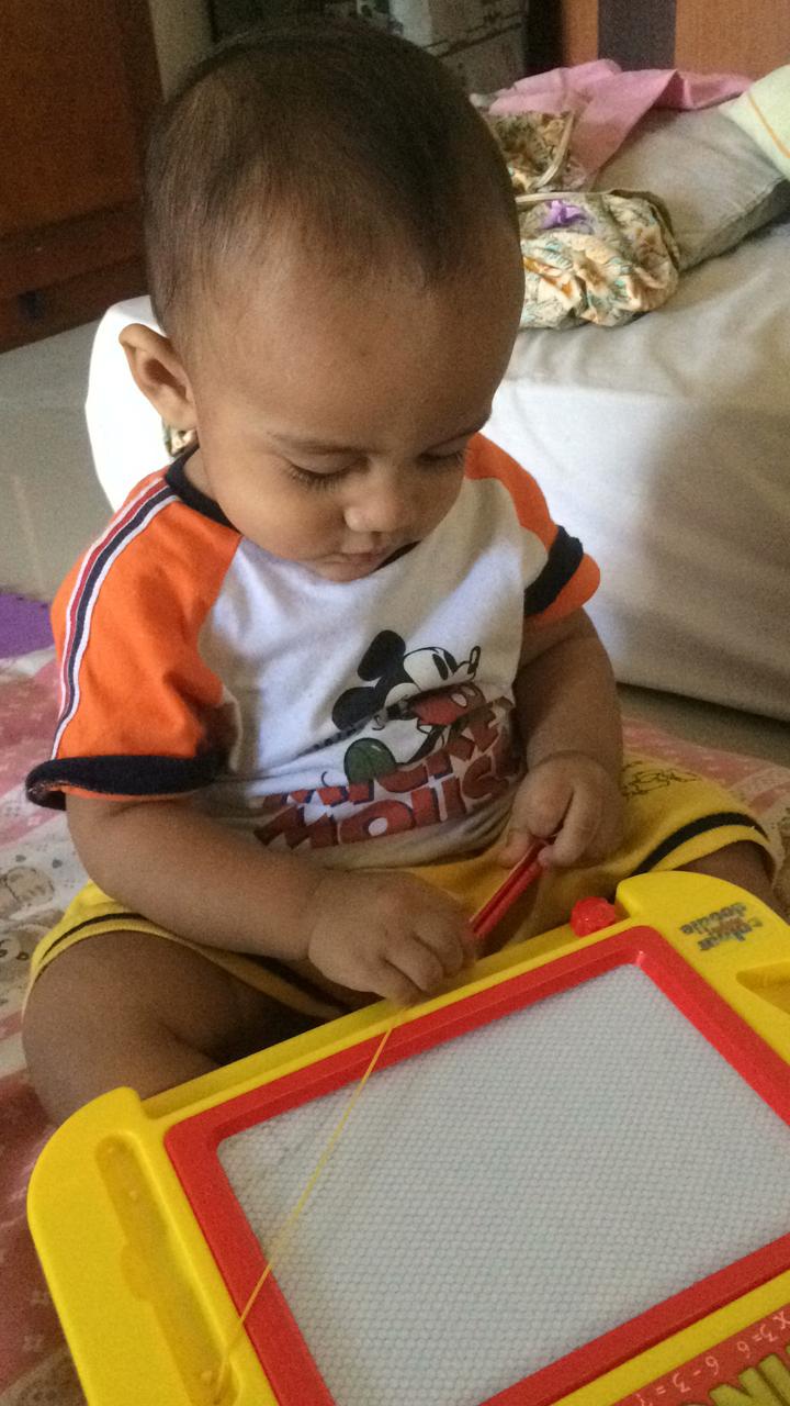 Dan sekarang Skye kalau dia tau kalau mau ditinggal, dia suka rewel dan pengen ikut (maklum, selama ini kita bertiga kemana2 bareng terus, hehe). Aku harus pura2 bodo amat karena memang harus cari duit. Setelah sampai kantor, aku dapet kabar dari ibuk kalau Skye udah ga nangis dan malah asik mainan papan ajaib, hihihi.